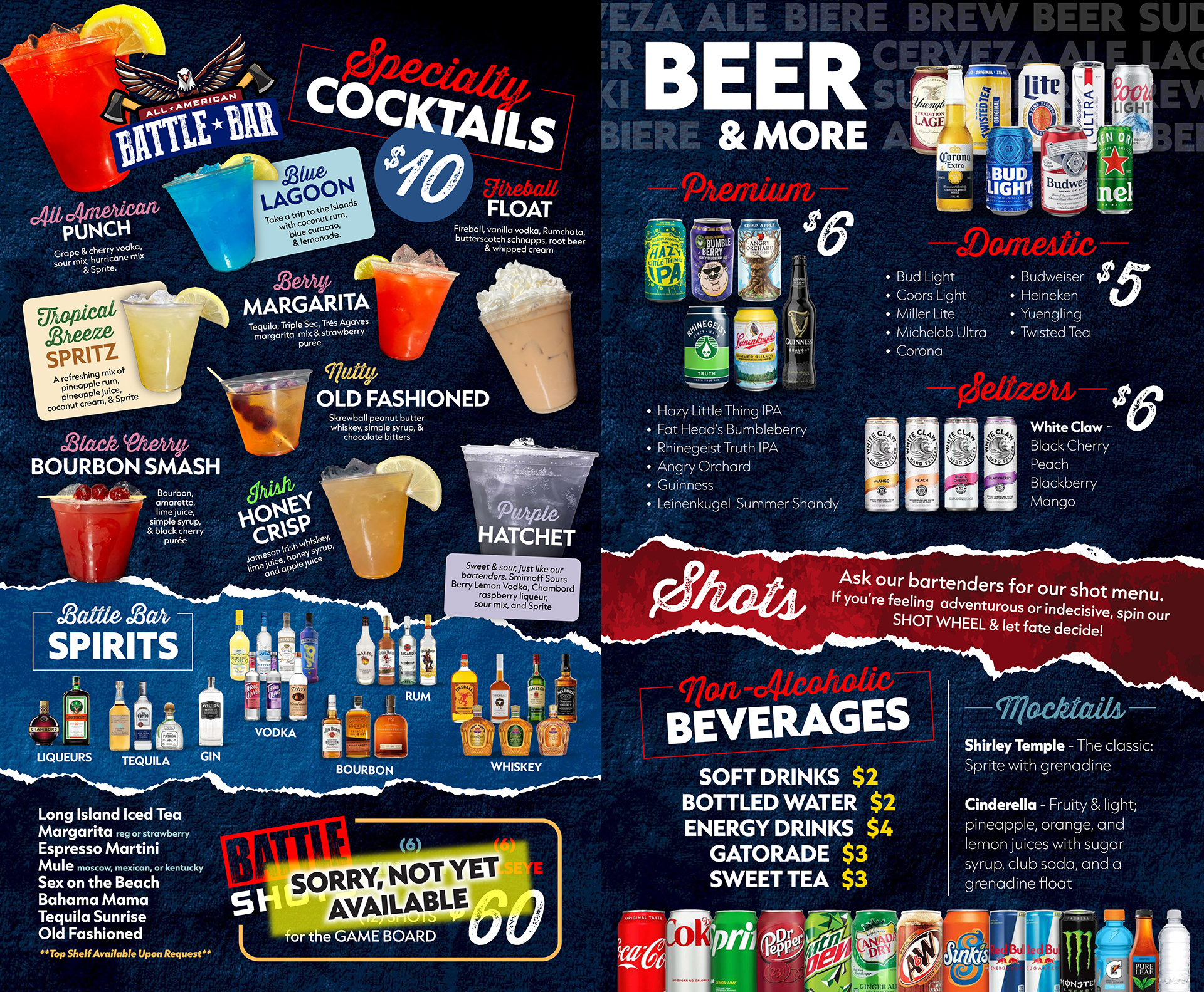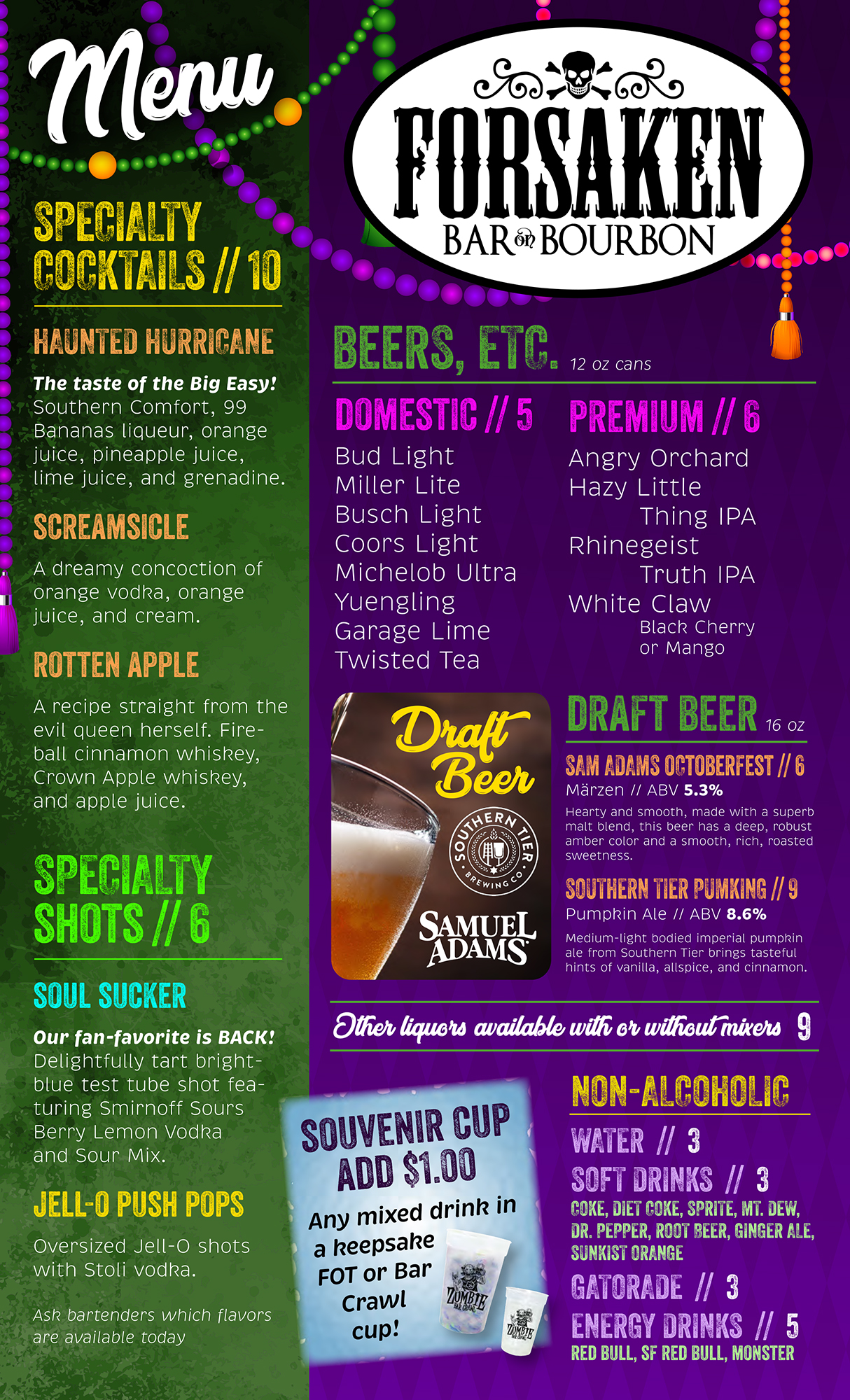 Visit our haunt and enjoy FIVE FULL BARS featuring multiple beers, liquor, specialty cocktails, shots, soft drinks, water, and more!