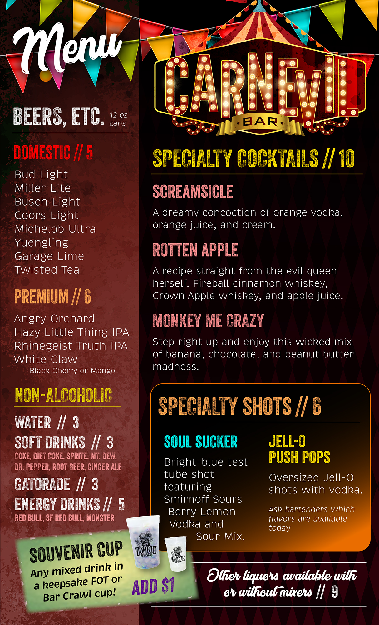 Carnevil Circus Bar is located in the midway before you enter the building. (MENU) **NOT OPEN ON SUNDAYS**