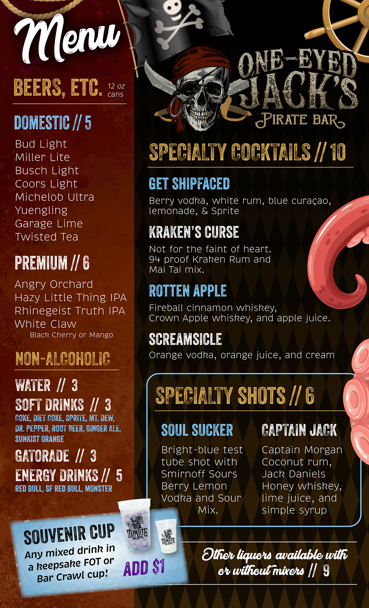 One-Eyed Jack’s Pirate Bar (21+) is located at the end of the last attraction. (MENU) **NOT OPEN ON SUNDAYS**