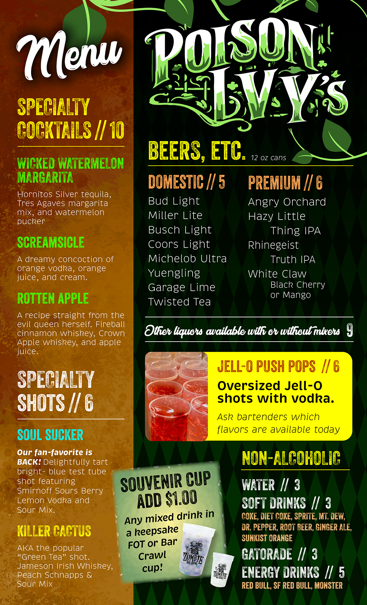 Poison Ivy’s Greenhouse Bar (21+) is located past the photo room before you enter the queue for the first attraction. (MENU) **NOT OPEN ON SUNDAYS**