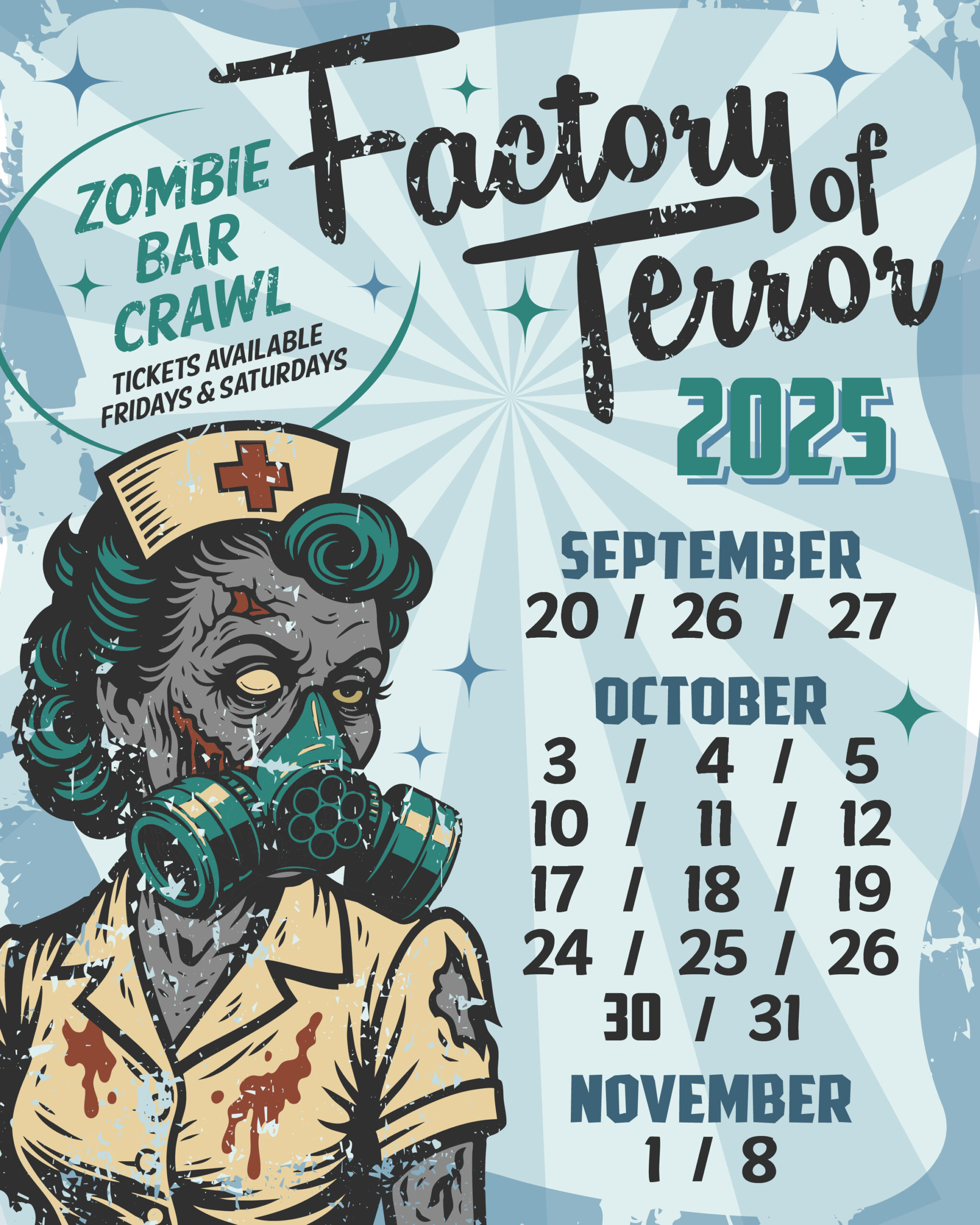 We’re open 20 terrifying nights from September 20 through November 8, with Zombie Bar Crawl tickets also available every Friday and Saturday.